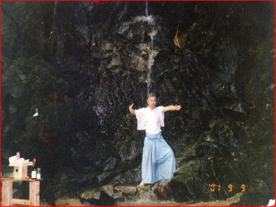 下の三段3段目の左右写真も中川八幡磐座宮前で行をする私の写真。